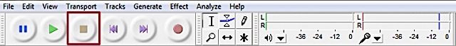 Paso 5: Espera. Permite que la sección deseada o la totalidad de la grabación se reproduzca antes de hacer clic en el botón Detener, representado por un cuadrado amarillo en Audacity y que generalmente se encuentra al lado del botón Grabar en la mayoría de las suites de audio.