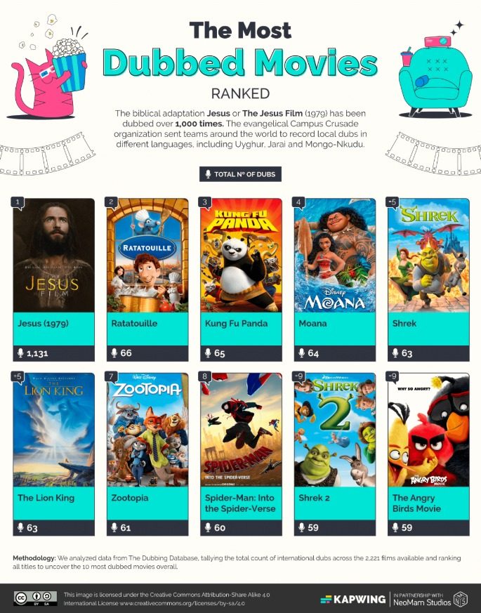 - Una película de 1979 sobre Jesús (Jesús/The Jesus Movie) fue doblada 1.131 veces, 17 veces más que cualquier otra película.