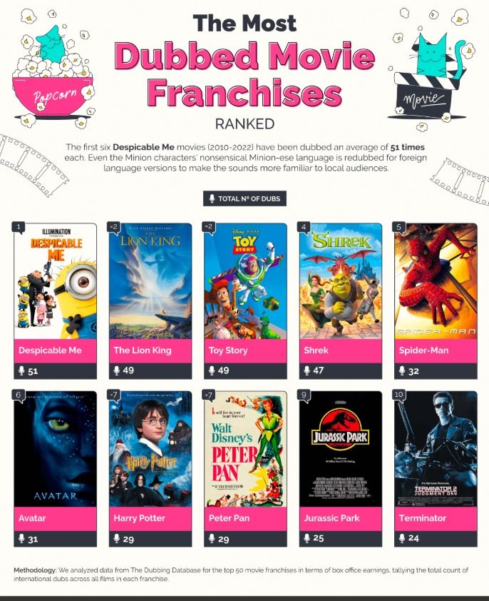 Para calcular las películas y franquicias más dobladas, contaron el número total de doblajes internacionales para cada título y franquicia. Las franquicias analizadas fueron las 50 principales en términos de ganancias de taquilla, según lo informado en la base de datos TheNumbers.