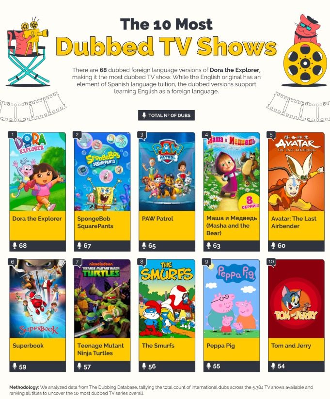 - Dora la Exploradora es el programa de televisión más doblado (68 versiones), superando por poco a Bob Esponja (67).