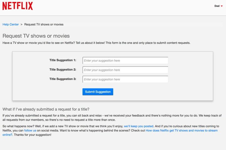 ¿Tienes una película o serie favorita que no estás viendo en Netflix? Puede ir a la página de ayuda de la compañía para sugerir hasta tres títulos a la vez que te gustaría agregar.