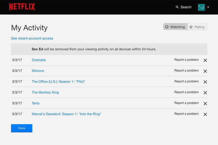 Ves al menú Mi actividad para ver todo lo que has visto en orden cronológico, luego presiona la X en el lado derecho de un título en particular para eliminarlo de tu historial de visualización.