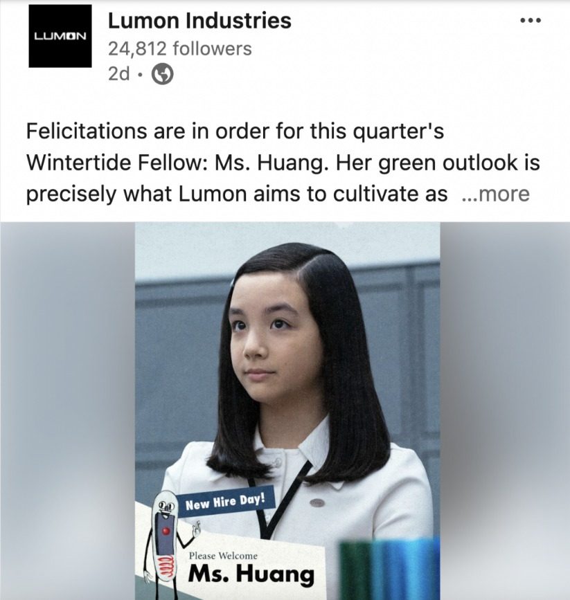 El 20 de enero, Lumon Industries celebró la contratación de la señorita Huang con una publicación que decía: “Las felicitaciones son para la becaria de Wintertide de este trimestre: la Sra. Huang. Su perspectiva verde es precisamente lo que Lumon pretende cultivar como organización. Ella será invaluable en nuestro piso cortado”.