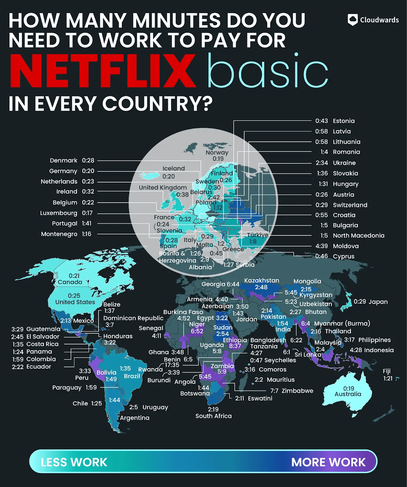 El equipo de investigación de Cloudwards recopiló datos sobre el ingreso medio estimado y el precio del plan de Netflix en 100 países y luego se hicieron algunos cálculos para tener una idea de cuántas horas de trabajo se necesitarían para pagar el gigante del streaming.