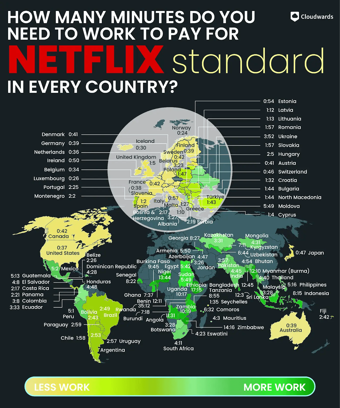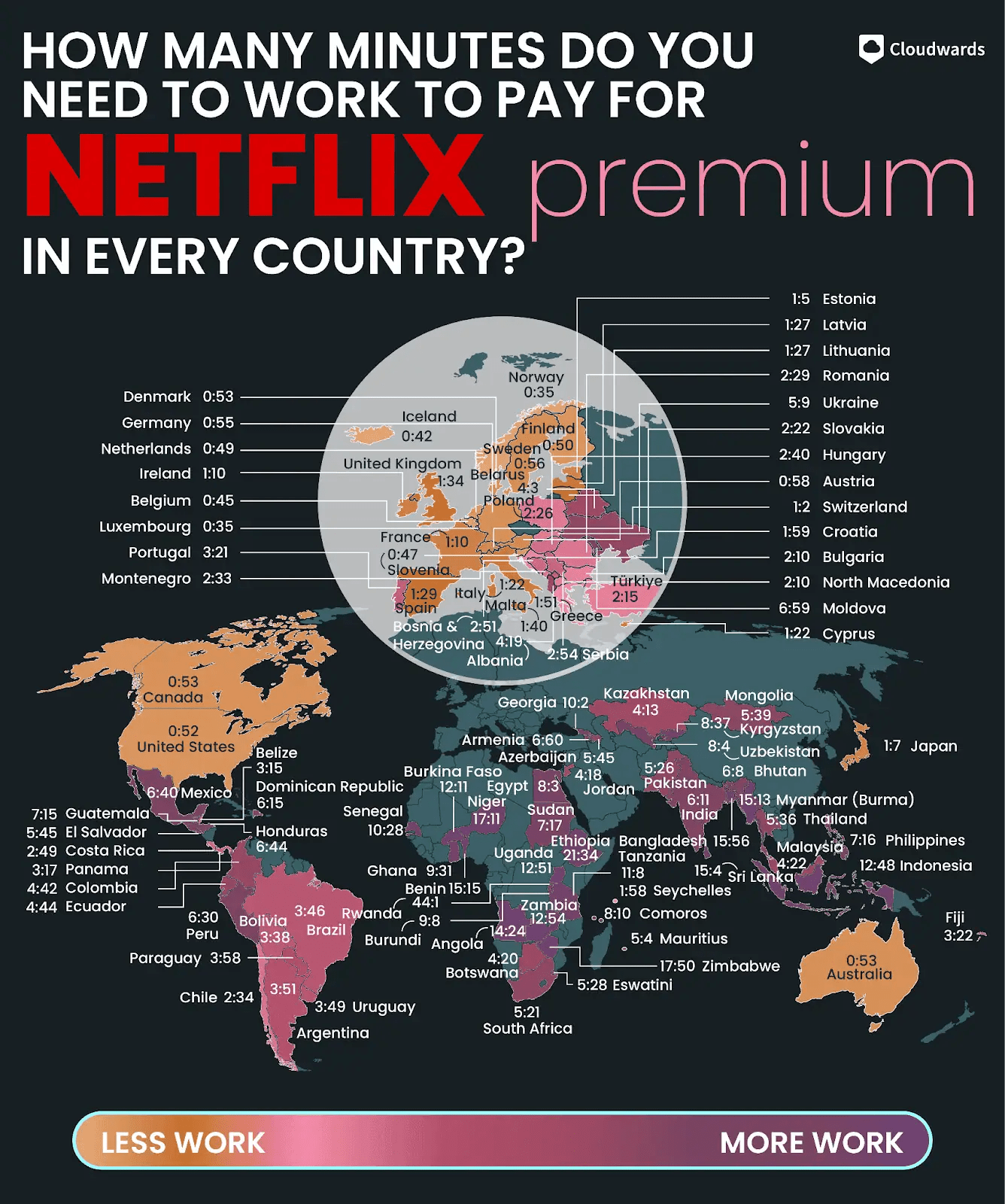 - Netflix Premium: El asalariado promedio necesitaría trabajar solo 35 minutos para pagar Netflix Premium en Luxemburgo y Noruega. En Ruanda, tomaría la friolera de 44 horas, 1 minuto (5 días, 4 horas).