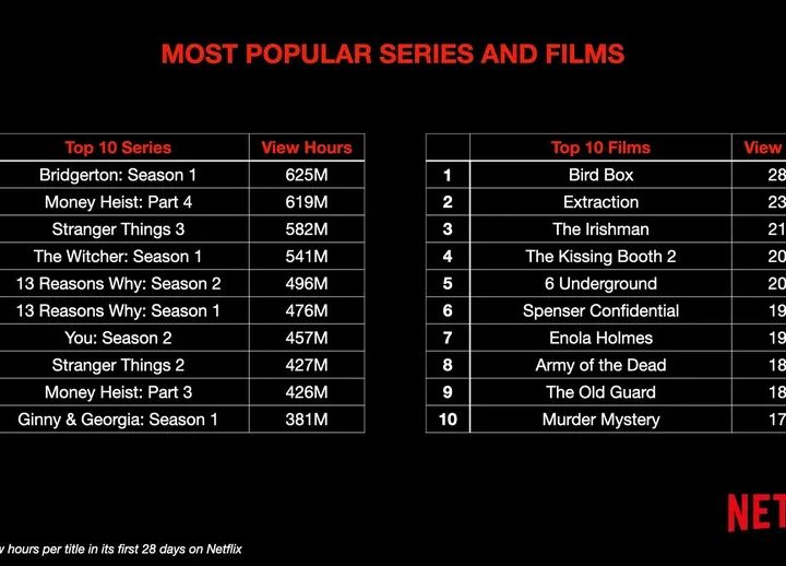 Por su parte, una segunda infografía dio a conocer las 10 mejores películas y series de Netflix en función del total de horas vistas durante sus primeros 28 días en el servicio.
