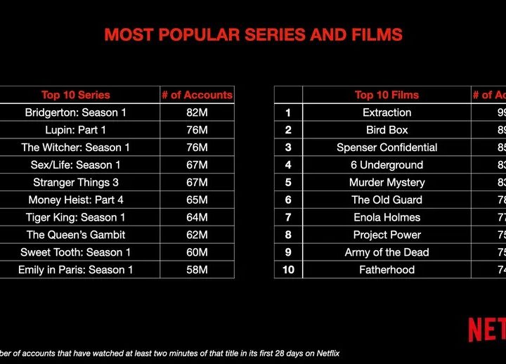 En las películas, Extraction quedó como la más popular con 99 millones de cuentas, seguida de Bird Box (89 millones) y Spenser Confidential (85 millones).