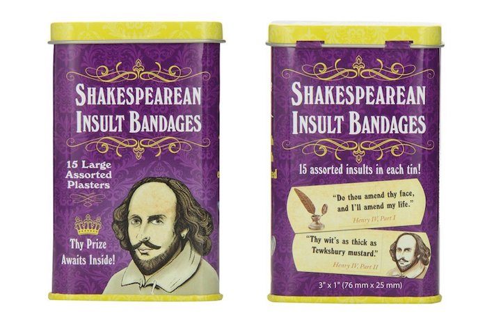 Añadir un buen insulto al daño nunca ha sido algo tan literal. Estos vendajes o tiritas con insultos de Shakespeare ofrecen una buena cantidad de sofisticados agravios para darle algo de desahogo a tus cortes y rasguños, elevando así tu estado de ánimo… y nivel de cultura. Siempre podrás usar parches regulares, pero ¿dónde está la diversión en eso? Por sólo $6 dólares te llevas una caja con 15 tiritas.