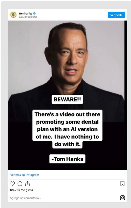 “¡¡CUIDADO !!” Hanks escribió en una publicación de Instagram ayer. “Hay un video por ahí promocionando un plan dental con una versión de IA de mí. No tengo nada que ver con eso”.