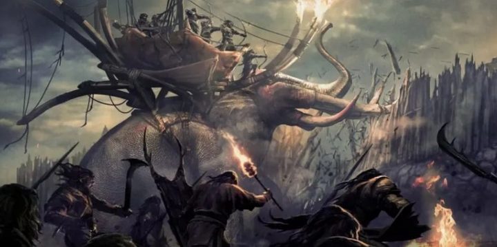 Aquí, los arqueros Haradrim en la cima del Mûmak están rompiendo la barrera de lo que solo podemos suponer que es Edoras.
