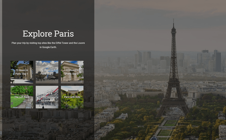 Google Earth ya tiene una aplicación llamada Trips, donde puede planear tus próximas vacaciones, pero puedes utilizar Google Earth para esto también. La pestaña Travel, ofrece puntos de interés de diferentes ciudades alrededor del mundo. Si eliges Paris por ejemplo, puedes encontrar historias como “72 horas en París: día 1”, donde podrás explorar diferentes puntos de interés.
