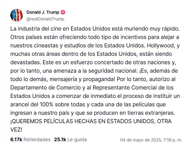 “Otros países están ofreciendo todo tipo de incentivos para alejar a nuestros cineastas y estudios de Estados Unidos”, algo que constituyó “un esfuerzo concertado de otras naciones y, por lo tanto, una amenaza a la seguridad nacional“. Para cambiar esto, Trump declaró que estaba autorizando al Departamento de Comercio y al Representante Comercial de los Estados Unidos a comenzar a agregar un arancel del 100 por ciento a “todas y cada una de las películas que ingresan a nuestro país y que se producen en tierras extranjeras”.