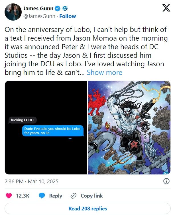 En X, Gunn compartió un intercambio de mensajes de texto con Momoa de octubre de 2022, cuando el cineasta de Guardianes de la Galaxia fue nombrado codirector ejecutivo de DC Studios con Peter Safran. Momoa le envió un mensaje de texto a Gunn, «F****** Lobo», a lo que Gunn respondió: «Amigo, he dicho que deberías ser Lobo durante años. No es mentira». Gunn publicó los textos junto con una foto de Lobo.