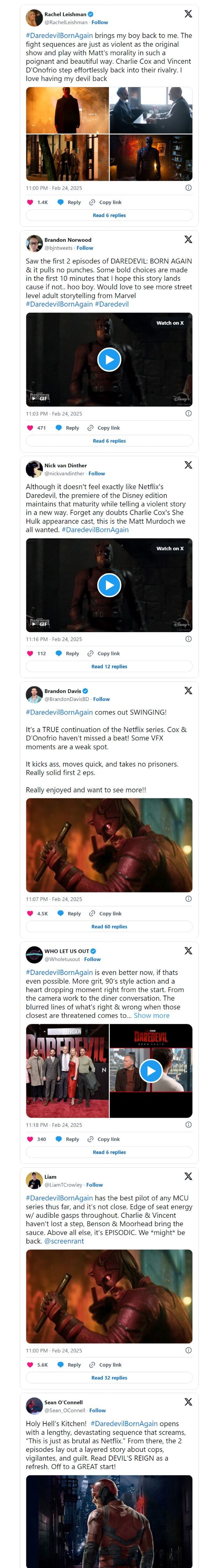 El estreno mundial de los dos primeros episodios de Daredevil: Born Again tuvo lugar esta noche, y las primeras reacciones están llegando en las redes sociales. En su mayor parte, la primera palabra es muy positiva. Sin embargo, más de unos pocos mencionaron algunos CGI cuestionables en los episodios. De todos modos, ver a estos actores de regreso en sus papeles junto a la mayoría del elenco de la serie anterior de Daredevil ha llevado a elogios casi universales por sus actuaciones.