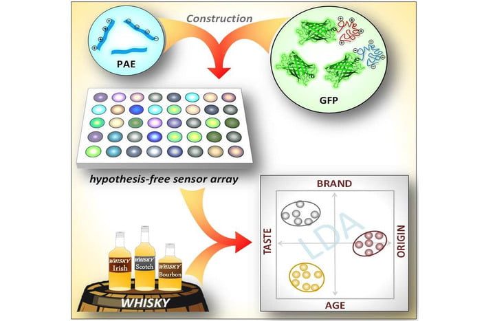 Resulta que este grupo fabricó una “lengua sintética” que utiliza 22 tipos de tintes fluorescentes diferentes para distinguir whiskies. Cuando la lengua se pone en contacto con un whisky es capaz de determinar el “perfil del sabor”, basándose en los cambios sutiles en el brillo de los tintes. En una prueba, la lengua pudo reconocer la marca, el origen, la mezcla, la edad y el gusto de 33 whiskies.