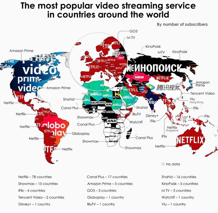 Gracias a un gráfico publicado en Visual Capitalist, web que ha creado un mapa con datos de FlixPatrol, fuente que examina periódicamente las plataformas con más suscripciones por país podemos ver las plataformas de streaming con más usuarios en cada país del mundo.