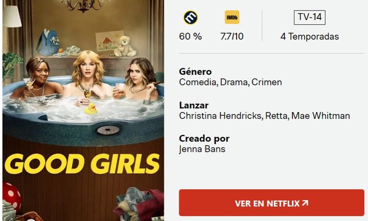 Es muy probable que te hayas perdido Good Girls durante sus cuatro temporadas en NBC, pero la serie tiene una segunda oportunidad de encontrar una audiencia en Netflix. Las chicas buenas titulares son todo lo contrario, pero no sin razón. Elizabeth “Beth” Boland (Christina Hendricks), su hermana, Annie Marks (Mae Whitman), y su amiga, Ruby Hill (Retta), se enfrentan a serios problemas financieros cuando se unen para robar una tienda de comestibles.