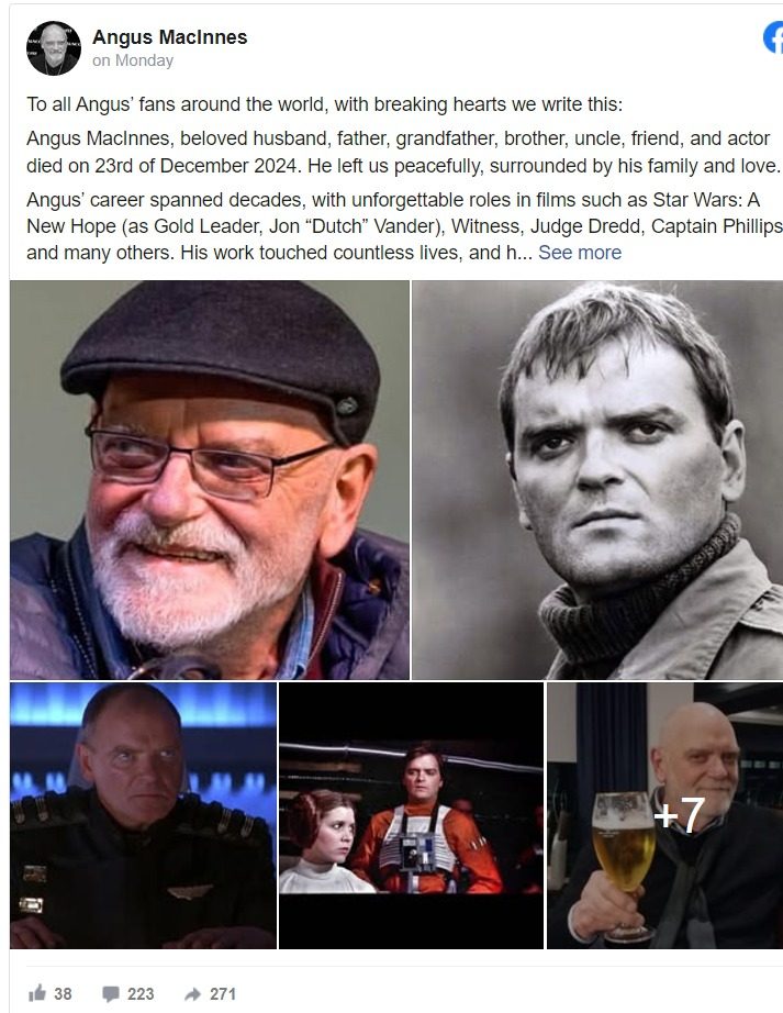 Una dura pérdida aqueja al mundo de Star Wars, ya que a los 77 años falleció el actor Angus MacInnes, quien interpretó al Gold Leader del escuadrón Rebelde que irrumpió contra la Estrella de la Muerte al final de “Una Nueva Esperanza“.