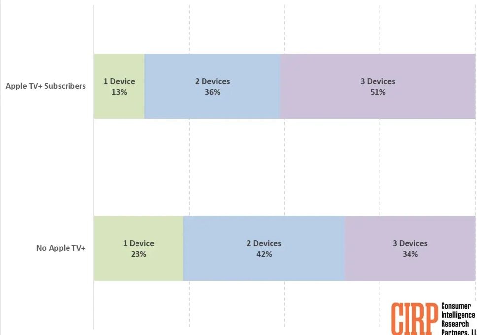 Aún mejor (para Apple), solo el 13% de los suscriptores de Apple TV+ poseen solo uno de los tres productos clave, en comparación con casi una cuarta parte de los clientes que no están suscritos a Apple TV+.