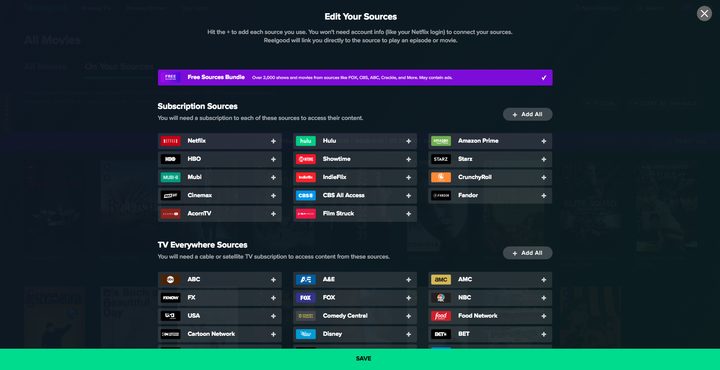De forma predeterminada, tendrás acceso al «Paquete de fuentes gratuitas», que incluye contenido de servicios como Fox, CBS y Crackle (ojo: puede que estos tengan anuncios de reproducción automática, pero al menos son gratuitos). Haz clic en cada servicio al que estés suscrito (o en cada plataforma que desees incluir en la búsqueda), y luego haz clic en Guardar. La próxima vez que busques, agregará películas, programas o series de cada una de las plataformas seleccionadas. Cuando elijas una película o una serie, Reelgood te ofrecerá enlaces de visualización directa para cada plataforma seleccionada, para así ir directamente a tu película o programa.
