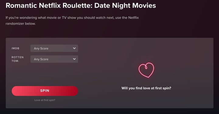 La Date Night Edition de la Roulette de Netflix permite a los usuarios ver las calificaciones de IMDb y Rotten Tomatoes de la película, y luego girar para conseguir una recomendación. Iniciar sesión con tu cuenta Reelgood te permite seleccionar otros servicios de transmisión –junto con o además de Netflix– de un grupo de películas románticas.
