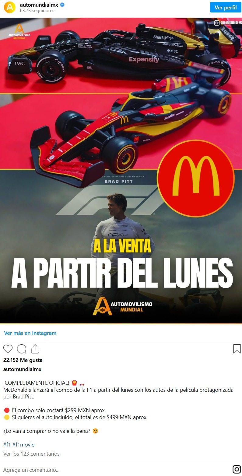 En las últimas horas la gente en México está inundando búsquedas en Google sobre la película F1 de Brad Pitt que se estrenará este jueves 26 de junio en cines, y una asociación con McDonald’s. ¿Pero, qué relación hay entre estas dos cosas?.
