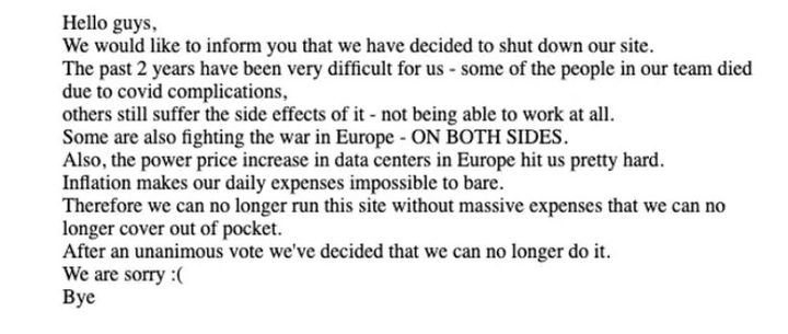 Al acceder a su dominio, se puede leer un mensaje de texto sobre un fondo blanco y plano, el cual explica los motivos del cierre definitivo: algunos de los miembros del equipo de Rarbg fallecieron durante la pandemia del covid 19 y otros todavía sufren consecuencias de la enfermedad, los costos de los centros de datos en Europa han subido demasiado de precio, y por supuesto, las consecuencias de la guerra. “Los últimos dos años han sido muy difíciles para nosotros”, dice el comunicado.