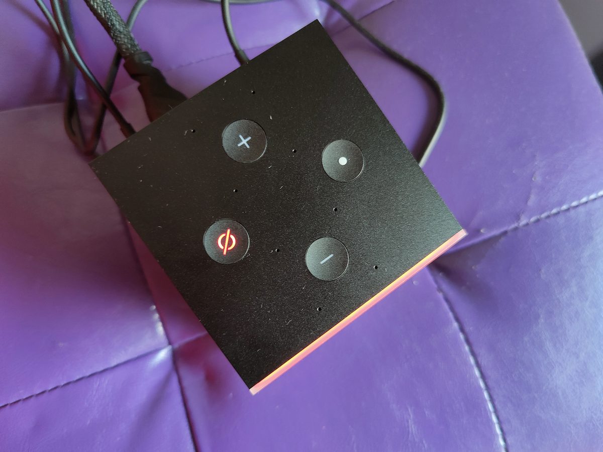 Como si fuera un altavoz inteligente, viene con los botones (en la parte de arriba) para regular el volumen, el de Acción (para cuando no quieres utilizar la voz) y el de encendido y apagado del micrófono. También ahí se encuentran unos micrófonos y la barra de luz que se enciende de color azul cuando Alexa está escuchando. En la parte de atrás, abajo, incorpora todas las entradas para conectarlo (puerto IR, micro USB, HDMI y el de alimentación).
