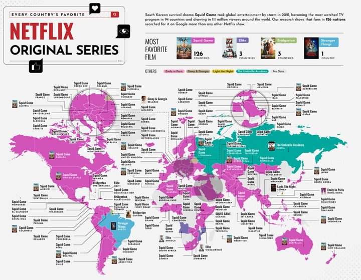La serie original de Netflix, Squid Game (El Juego del Calamar), demostró ser el programa de televisión más popular en general, encabezando los datos de búsqueda en126 países.