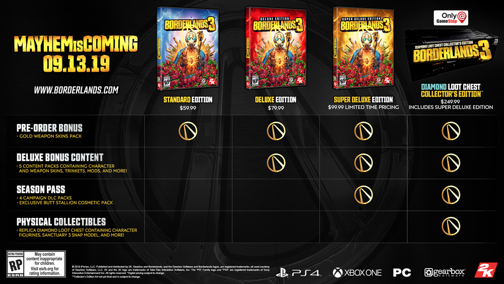 Habrá varias versiones diferentes del juego disponibles. La edición estándar costará $60 dólares. e incluirá el bono de pre-pedido de las carátulas doradas, mientras que la «Edición Deluxe» de $80 dólares también incluirá los paquetes Retro, Neon y Gearbox, así como armas y modificaciones adicionales. La versión «Super Deluxe» de $100 dólares incluirá todo lo anterior, además de cuatro paquetes de campaña y las skins «Butt Stallion».