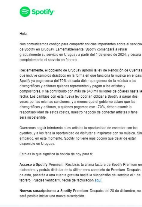 “Nos comunicamos contigo para compartir noticias importantes sobre el servicio de Spotify en Uruguay. Lamentablemente, Spotify comenzará a retirar gradualmente su servicio en Uruguay a partir del 1 de enero de 2024, y cesará completamente el servicio en febrero”, dice el mensaje que recibieron los usuarios.