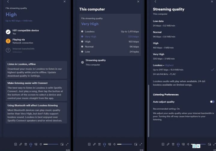 La calidad de transmisión de archivos que puede esperar con Lossless puede ser de hasta 1,411 kbps, que es significativamente más alta que la configuración Muy alta, que transmite a 320 kbps. Además, puede llegar hasta 2.117 kbps, registrando hasta 15,9 MB por minuto con Lossless. Spotify también menciona que incluso la pérdida de 24 bits está disponible en canciones limitadas que se reproducen a través del formato de audio FLAC.