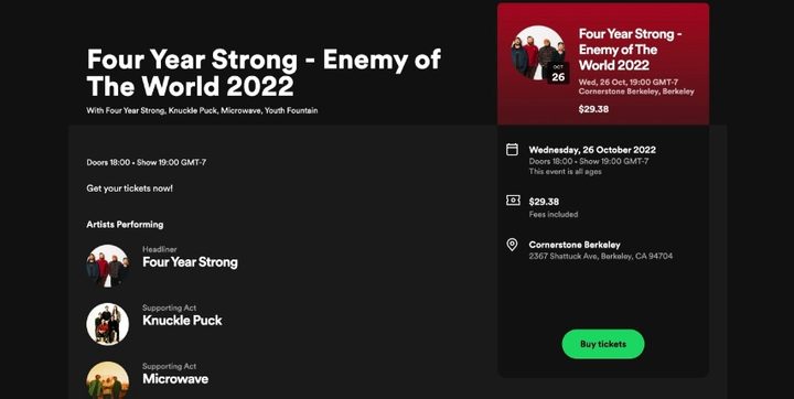 El nuevo sitio web de la compañía enumera los próximos conciertos y permite a los usuarios comprar boletos para estos espectáculos a través de tarjetas de débito o crédito; sin embargo, los usuarios deben tener una cuenta de Spotify para comprar boletos.