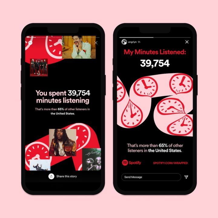 Esto incluye canciones, artistas, bandas, álbumes y podcasts. También se exhibe el total de minutos escuchados durante el año y un porcentaje que lo compara con el total de cada artista a nivel planetario.