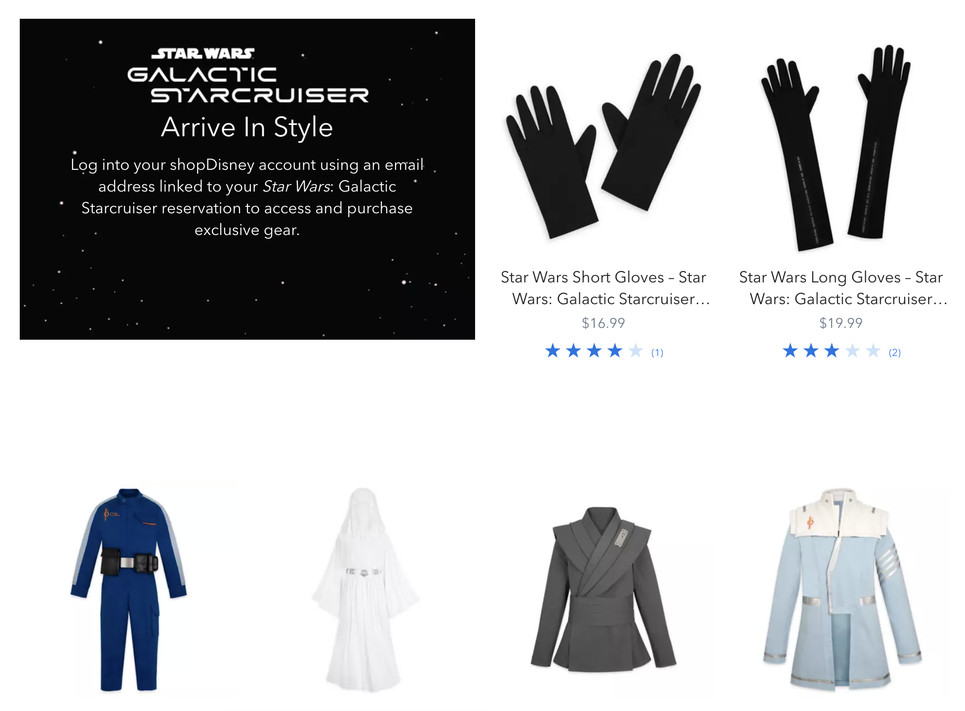 En ShopDisney.com, el vestuario y el equipo seleccionados del Galactic Starcruiser solo están disponibles para su compra con el uso de un correo electrónico vinculado a una reserva a bordo de la nave.