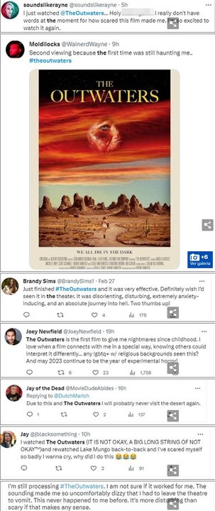 - «Todavía estoy procesando #TheOutwaters. No estoy seguro de si funcionó para mí. El sonido me mareó tanto que tuve que salir del teatro para vomitar. Esto nunca me había pasado antes. Es más perturbador que aterrador si eso tiene algún sentido».