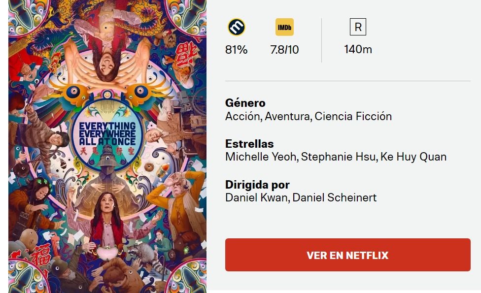 Michelle Yeoh interpreta a Evelyn Quan Wang, una mujer cuya vida se ha estancado. Evelyn está en gran medida distanciada de su hija, Joy Wang (Stephanie Hsu de The Fall Guy), su lavandería está bajo una auditoría del IRS, e incluso el esposo de Evelyn, Waymond Wang (Ke Huy Quan), está listo para dejarla. Luego, Evelyn se entera de que el multiverso está en peligro, y ella es la única que puede salvarlo reconectándose con su hija a través de la realidad.