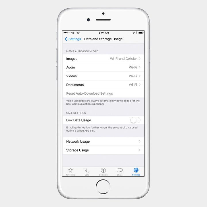 Si estás utilizando muchos datos móviles, puedes controlar el uso de datos de esta app, al dirigirte a Configuración> Datos y Almacenamiento. Aquí, puedes elegir si quieres que los documentos, fotos y vides sean descargados por Wi-Fi, por la red de tu operador o por cualquiera. Si utilizas WhatsApp principalmente para hacer llamadas, puedes prender la opción Disminuir Uso de Datos para minimizar la cantidad de datos que utilizas durante las llamadas. Puedes también monitorear el uso de tu red y almacenamiento del usuario para ver cuál de tus contactos envía más datos.