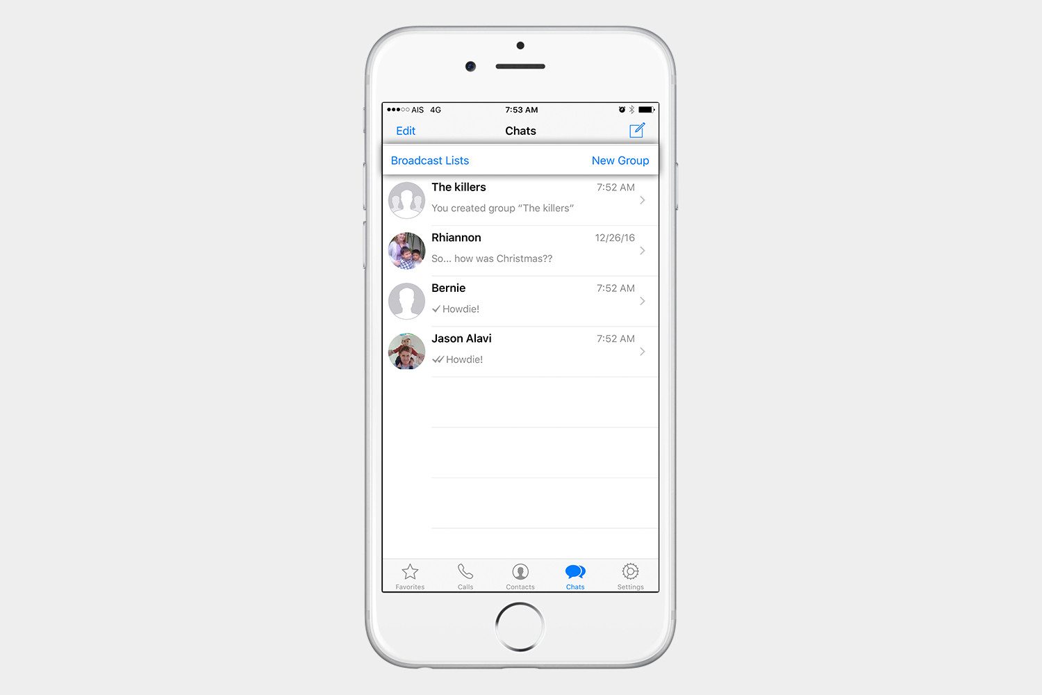 En la opción Chats, verás las opciones Lista de Emisiones y Nuevo Grupo. Puedes utilizar listas de emisiones para enviar un mensaje a múltiples contactos al mismo tiempo. La opción Nuevo Grupo la puedes utilizar cuando quieres crear un grupo y chatear con más de una sola persona al mismo tiempo. La emisión no mostrará al receptor a quién más enviaste el mensaje. La diferencia es que en una emisión estás enviando un mensaje individual a múltiples personas, mientras que en el grupo se lo estás enviando a los miembros para que todos lo vean y puedan responder en un mismo canal.