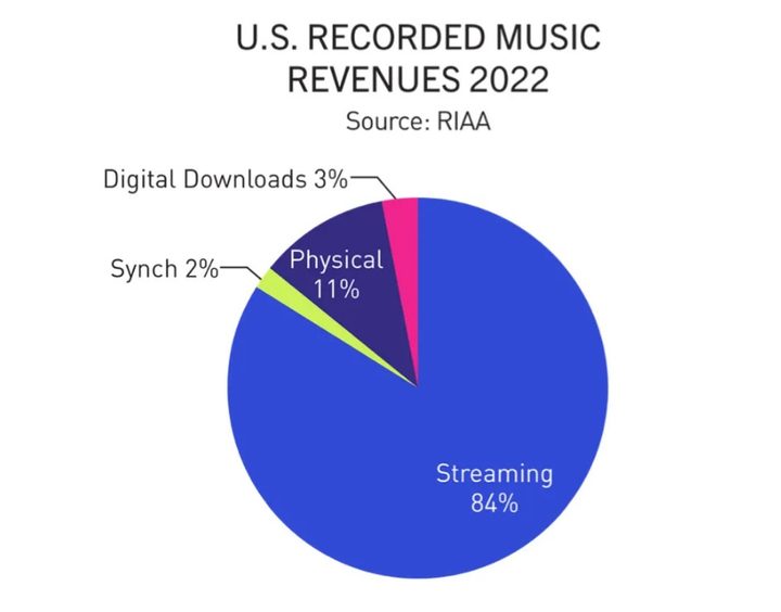 El informe de la RIAA encontró que los servicios de transmisión de música como Spotify y Apple Music representaron un enorme 84 por ciento de los ingresos totales de música en 2022, habiendo crecido un siete por ciento en comparación con el año anterior a un récord de $ 13.3 mil millones. Las ventas de descargas digitales, sin embargo, continúan disminuyendo. El formato se desplomó en un 20 por ciento este año a solo $ 495 millones, habiendo caído ya en un 12 por ciento en 2021.
