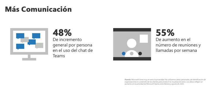 Según el Informe de índice de tendencias de trabajo de Microsoft fechado en septiembre de 2020, se produjo un aumento del 48 por ciento en los chats de Microsoft Teams por persona en general, con un aumento del 55 por ciento en el número de reuniones y llamadas por semana. Estos datos demuestran que, aunque no se interactúa en persona, no han dejado de hacerse conexiones.