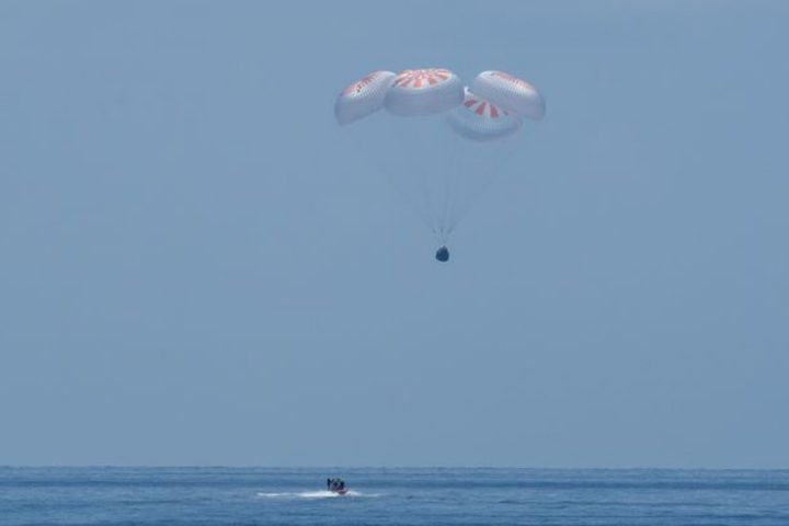 Luego, la cápsula encendió sus propulsores, salió de órbita y se dirigió hacia la Tierra. A medida que avanzaba a toda velocidad por la atmósfera superior del planeta el Crew Dragón soportó temperaturas de hasta 3,500 grados Fahrenheit (1,926 grados celsius).