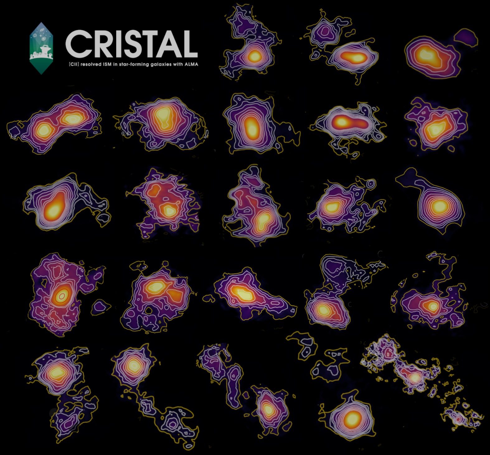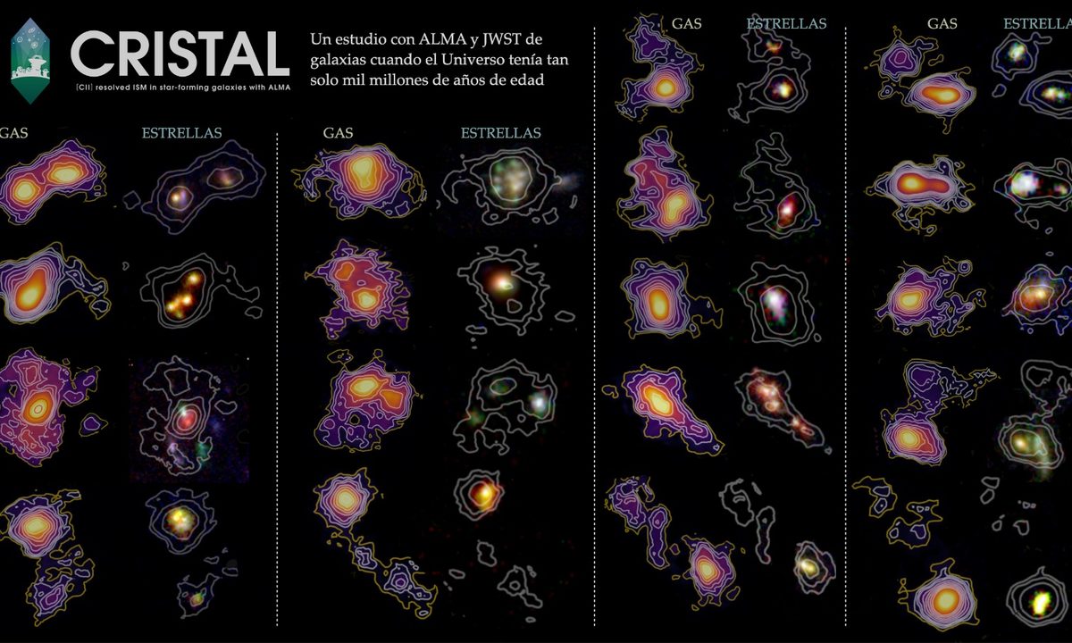 A través del proyecto CRISTAL (“[CII] Resolved ISM in STar-forming galaxies with ALMA”) se logró realizar el primer “censo” del gas, el polvo y las estrellas en galaxias cuando el Universo tenía apenas mil millones de años. Esto fue posible gracias a observaciones conjuntas realizadas con el observatorio ALMA, desde Chile, y los telescopios espaciales James Webb y Hubble.