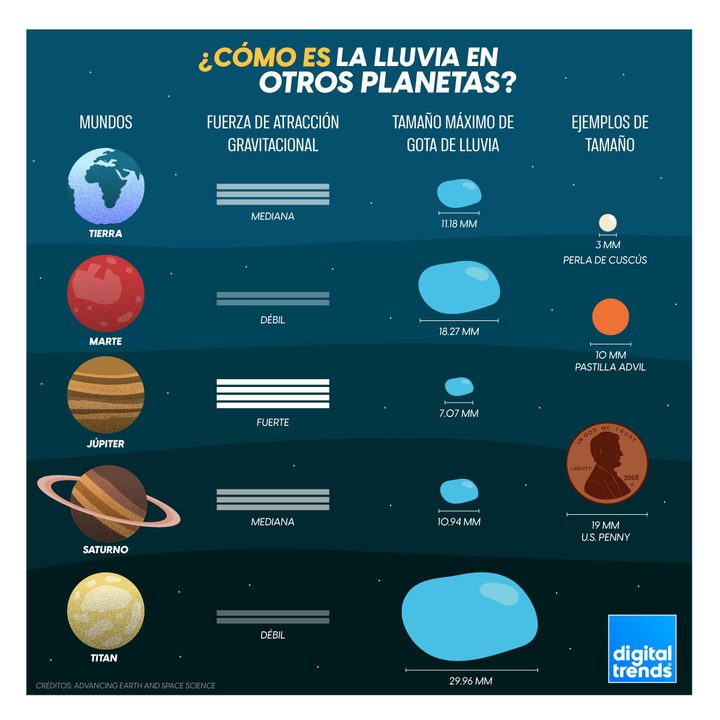 Además, hallaron que el material del que está hecha una gota de lluvia en cada planeta no tuvo un impacto considerable en el tamaño de la gota.