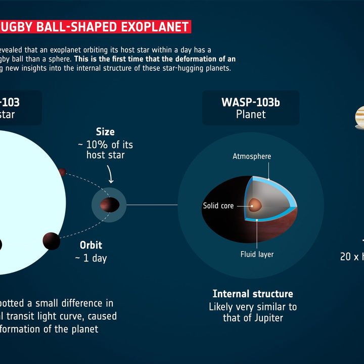 Se trata de WASP-103b, considerado el primer exoplaneta ovalado que se descubre. De acuerdo con los investigadores, se encuentra en la constelación de Hércules y tiene ese aspecto porque ha sido deformado por las fuertes fuerzas de marea entre el planeta y su estrella anfitriona WASP-103, que es unos 200 grados más caliente y 1.7 veces mayor que el Sol.