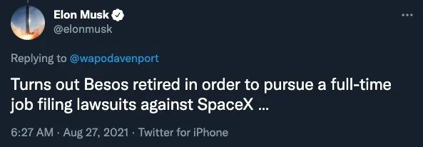 “Resulta que Besos (sic) se retiró para dedicarse a tiempo completo a presentar demandas contra SpaceX”, compartió.