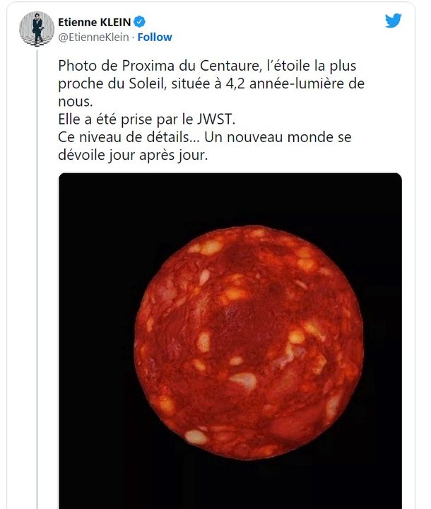 Un chascarro de proporciones épicas es el que vivió Étienne Klein, un célebre físico y director de la Comisión de Energías Alternativas y Energía Atómica de Francia, quién compartió la imagen de una salchicha española y la confundió con la estrella Próxima Centauri, describiendo el hallazgo culinario como una toma hecha por el Telescopio Espacial James Webb.