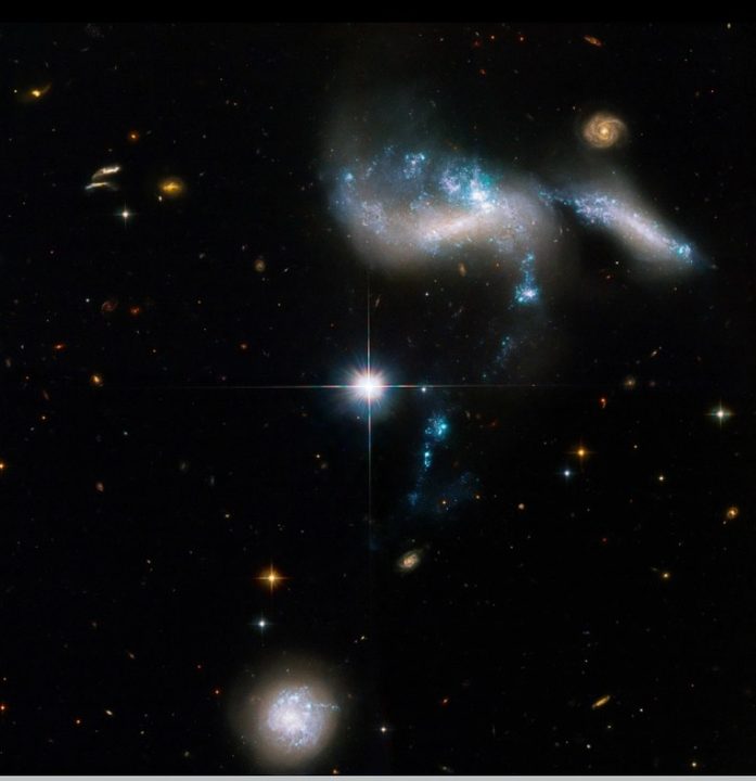 Una imagen del Telescopio Espacial Hubble compartida esta semana por la NASA muestra una interacción inusual de cuatro galaxias enanas. Hay dos galaxias pequeñas que están tan juntas que parecen un objeto, llamado NGC 1741, ubicado en la parte superior de la imagen. Luego hay otra galaxia en forma de cigarro cerca a la derecha, y una cuarta galaxia en la parte inferior izquierda que está conectada a las otras tres por una corriente de estrellas jóvenes.