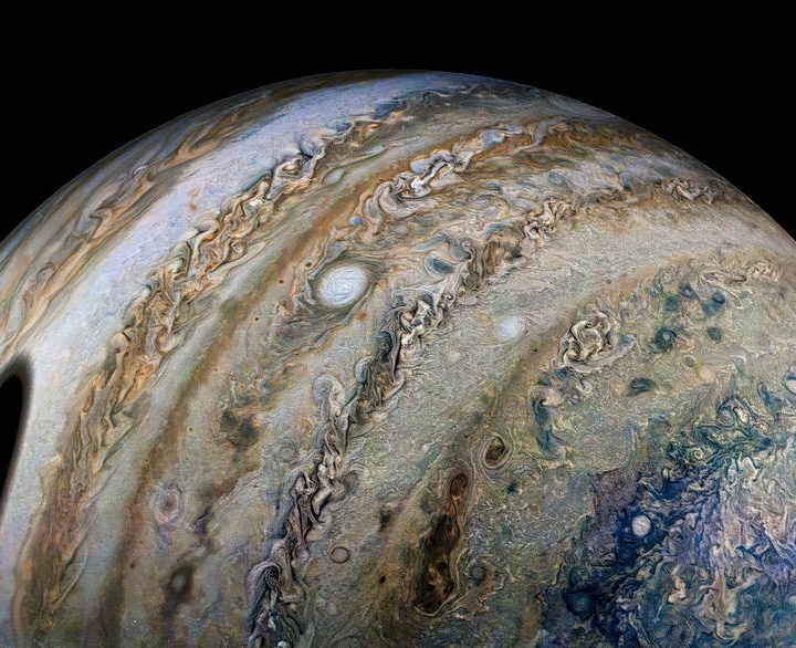 “El científico ciudadano Thomas Thomopoulos creó esta imagen de color mejorado utilizando datos en bruto del instrumento JunoCam. En el momento en que se tomó la imagen en bruto, la nave espacial Juno estaba a unas 44,000 millas (71,000 kilómetros) sobre las nubes de Júpiter, a una latitud de aproximadamente 55 grados al sur, y 15 veces más cerca que Ganímedes, que orbita a unas 666,000 millas (1.1 millones de kilómetros) de distancia de Júpiter”.