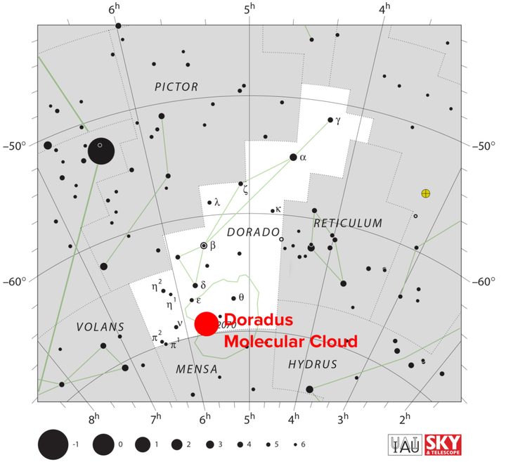 30 Doradus es una gran incubadora de estrellas ubicada muy cerca de la Vía Láctea (está a tan solo 170.000 años luz de distancia), en el corazón de la famosa Nebulosa de la Tarántula, en la Gran Nube de Magallanes. Allí se encuentra el cúmulo de estrellas más grande del vecindario cósmico –un objeto de observación perfecto para quienes buscan estudiar el nacimiento y la evolución de las estrellas. En el centro de 30 Doradus se encuentra una brillante incubadora de estrellas que ha sido la cuna de más de 800.000 estrellas y protoestrellas, entre ellas medio millón de jóvenes estrellas masivas y calientes. Esta región reviste especial interés para quienes estudian la formación de estrellas y la evolución de las galaxias debido al efecto de la gravedad y la retroalimentación estelar.